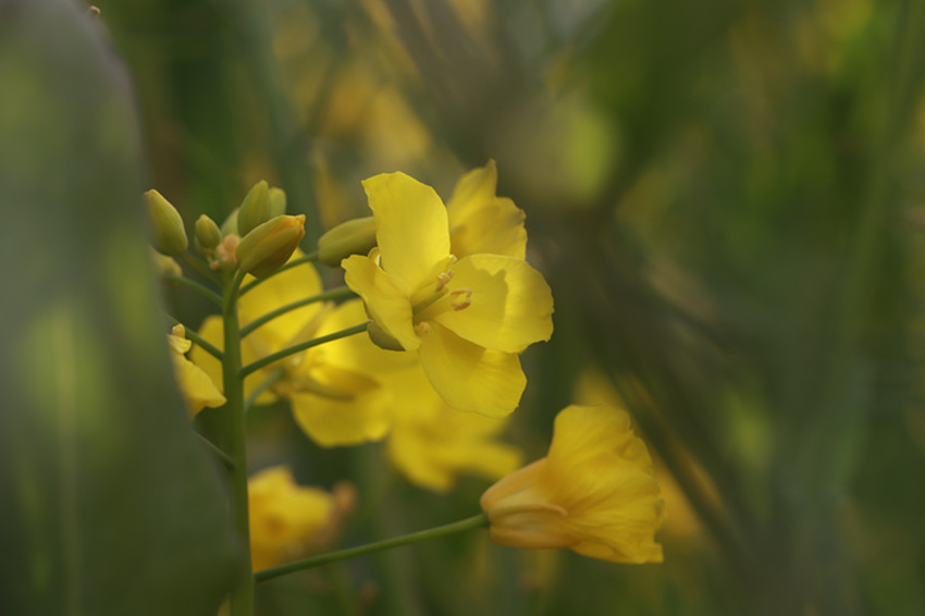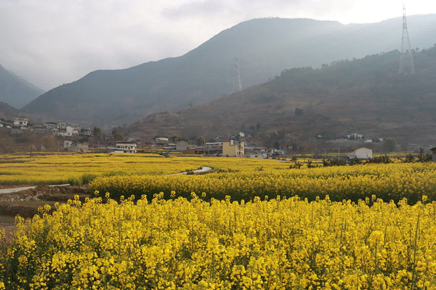 金黃的油菜花美美地填滿了整片田野,與藍天白云、村落人家相映成趣。順著田埂漫步花海,花香四溢,沁人心脾。微風吹來,一朵朵油菜花在風中搖曳,嬌嫩的花蕊隨風飄動,仿若身著金黃色輕紗的少女在翩翩起舞,靈動迷人。在花叢中飛舞的蜜蜂為花田增添了靈動和生氣,一掃冬日的沉悶,帶給人明快舒朗的好心情。成片盛開的油菜花與前來賞花的游人相映成趣,游人們拿出手機、相機,尋找最佳的角度,定格醉人美景,讓人忍不住贊嘆:好一番田園美景。