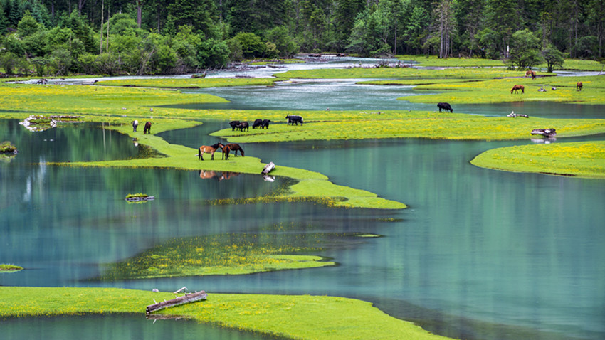 走進(jìn)月亮湖,彎彎的湖水呈耀眼的寶綠色,湖邊是綠悠悠的草地,在這里扎營(yíng)感覺(jué)就像是住進(jìn)了綠野仙蹤的童話世界里。