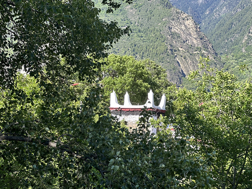繼續(xù)朝寨子深處走去,一片青稞地邊放著一個竹背簍,里面裝著大半背簍嫩羊草。地里有人在躬身除草,聽到我們經(jīng)過,她直起身來看,原來是一位眉目清秀的嘉絨阿婆。姑娘用方言對她說:“這一行人是來采集嘉絨民情風(fēng)俗的作家?!卑⑵畔矏偟爻覀冃泻险贫Y,并不住地說著歡迎的話。我們的停留,沒有打擾到她放下手里的那把羊草來迎接,這是我見到過最得體的事情。