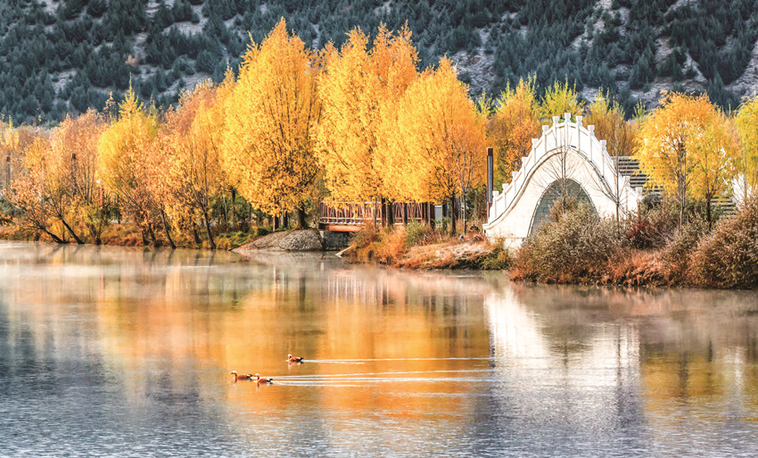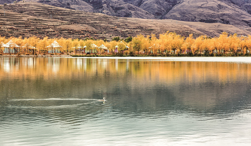除了巍峨的雪山與彩林作伴,不少越冬的候鳥也飛抵珠牡湖。金色彩林倒映在清澈如鏡的湖面上,不時有候鳥游過,激起層層漣漪,為珠牡湖增添了不少生機(jī)與趣味。