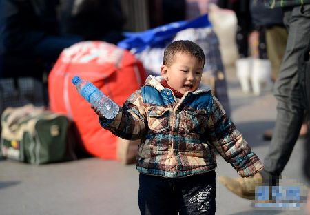 1月19日,一個(gè)小男孩在南京火車站幫家長(zhǎng)推運(yùn)行李。