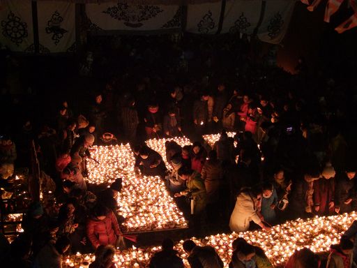 康定的幾座黃教寺廟舉行了法會,擺酥油花,燃元根燈供佛。信教群眾除在家供燈外,有的還登跑馬山,赴南無寺敬燈油。入夜后又成群結(jié)隊(duì)涌向康定城中的安覺寺,參加元根燈會,以此紀(jì)念藏傳佛教格魯派創(chuàng)始人、宗喀巴大師圓寂成佛。安覺寺里人潮涌動,熱鬧非凡。有扶老攜幼的信教群眾,有祈求平安的生意人,也有慕名而來的外地?cái)z影師。燈會這天,最忙碌的除了寺廟里的喇嘛,就數(shù)在寺廟周圍站崗的消防員了,消防員李剛說:“一大早就有遠(yuǎn)道而來的信教群眾和僧尼到寺廟里點(diǎn)燈了,為了保障寺廟的消防安全,我們已經(jīng)在這飄著雪花的冬日里站了整整一天了,要等到每一盞燈都安全的燃盡,我們才可收隊(duì)離開。”