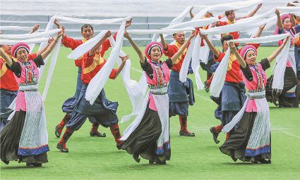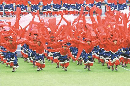 8月8日上午,康定北門體育場內(nèi)歌舞升平、彩旗飄揚,第九屆康巴藝術節(jié)開幕式文藝演出在此進行最后一次帶妝彩排。本次彩排也讓我們對開幕式文藝演出充滿了期待。