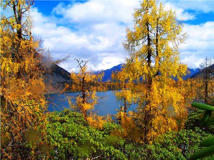 丹巴的秋是有著美麗色彩的季節(jié),你瞧,在峽谷兩岸的山巔,那一簇簇綠樹在一夜之間竟然點綴上了黃的、紅的顏料,就像是一名丹青能手不小心間打翻了調(diào)色盤,讓那些靈動的顏料在樹冠上潑灑。黃色的樹葉正印證了“滿樹盡帶黃金甲”的意境,黃得透徹,黃得潔凈。而那些紅色的樹葉,猶如盛開的鮮花,在逐漸蕭條的秋日里顯露出勃勃生機……那一片片黃紅綠相間的顏色,一寸一寸的往下挪移,讓看慣了春色綠野滿山的人們驚呼大自然的鬼斧神功之作。山腰,蔥綠的樹一棵連著一棵,密密層層,頑強地抵抗著秋風(fēng)的寥落,然而,那黃的紅的顏料終歸于要流向峽谷底,所經(jīng)之處,風(fēng)刺骨,葉瑟縮,大地又將再次被剝蝕掉華麗的外衣,露出山的嶙峋。我想,在山巔,那些樹葉在秋寒的作用下,依依不舍地與樹枝作別,隨風(fēng)抖落,在樹林中上下翻飛,猶如一只只美麗的彩蝶在林中翩翩起舞,當落到地面上時,發(fā)出生命即將逝去時的低低嘆息聲,然而那哀傷卻沒有醞釀太久,幾只小蟲迅速地聚集在葉片底下,為尋找到過冬的庇護所而興奮不已,那些葉片也感受到了生命存在的意義,為自己即將化為塵土前還能再次發(fā)光發(fā)熱而激動。跟隨著秋的步伐,獨自一人穿行在秋色滿滿的樹林中。眼前,一片片落葉漫空飛舞,伸出雙手,讓那些黃的紅的葉片降落在手心里,一絲淡淡的蘋果香味從小小的葉片中透出,悠悠的在我鼻尖縈繞。那一片片落葉,不正是秋日向大地母親發(fā)出的明信片嗎!春夏兩季,大地母親用自己的乳汁哺育著這些葉片,泛著健康的綠色,渲染了大地,茁壯的成長。那透心的綠,將大地裝扮得格外的妖嬈,充滿了無限的活力。秋日漸近,它們在秋風(fēng)的浸透下,剝蝕掉綠色的外衣,消耗掉多汁的綠葉,逐漸的消瘦,最后薄如蟬翼,在秋風(fēng)的吹拂下,在大地母親的召喚下,終于脫離枝條,晃晃蕩蕩的飄向地面。