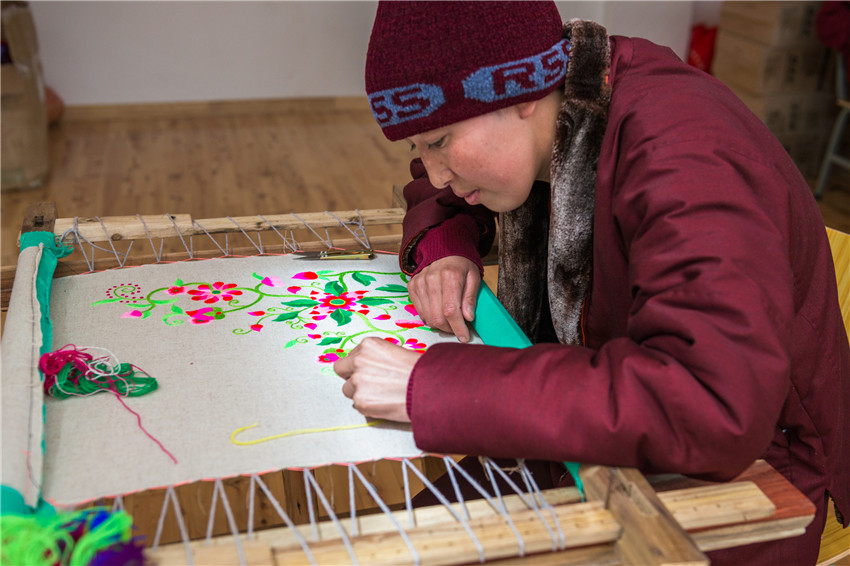 行攝途中經(jīng)過(guò)塔公鎮(zhèn)扎西寺,遇見(jiàn)康定市婦聯(lián)邀請(qǐng)到的中國(guó)國(guó)家級(jí)非物質(zhì)文化遺產(chǎn)藏羌織繡傳承人,正在為自愿報(bào)名的數(shù)十名覺(jué)姆傳授藏繡圖案基礎(chǔ)知識(shí)、藏繡圖案的常見(jiàn)表現(xiàn)形態(tài)、挑繡、納花繡、鏈子扣、扎花、提花、拼花、勾花和手繡等各種繡法技能。佛教的學(xué)習(xí)本是無(wú)止境的,我被這安靜、專注的場(chǎng)景深深感染,按下相機(jī)快門的一瞬就記錄了朵朵盛開(kāi)在指尖的蓮花。