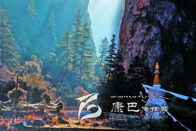 進(jìn)得溝來(lái),卻又是另一番景致。溪水在窄細(xì)的深谷中忽隱忽現(xiàn),水聲叮咚,時(shí)而從碎石卵灘下潛淌,時(shí)而冒出雪花樣的身影,不張揚(yáng),含靦腆,與兩邊千仞峭崖的兇猛樣恰成強(qiáng)烈對(duì)比。此時(shí)容不得你不抬頭望山,望天了。極盡險(xiǎn)峻的峭壁奇峰,危巖巨石,陰面如潑了墨暈,陽(yáng)面露了慘白,硬硬地把個(gè)溝谷擠成了“一線天”,駭?shù)谜锪锏奶焐弦粌蓤F(tuán)亂云也不敢停歇片刻,欲飄走,卻又被錯(cuò)落參差的山峰撕得七零八落。更有那墨黑如黛的松柏齊齊地排隊(duì)豎立在危崖峭壁間,或一兩階,或三四階,如挎刀武士護(hù)著峭崖,又如黑大漢長(zhǎng)的亂糟糟的絡(luò)腮胡,徒增添了猙獰之貌。傳說(shuō)皮察溝內(nèi)有座黑教的神山——呷拉神山,每到“朝山會(huì)”,農(nóng)牧民前去神山朝拜。然而,呷拉山頂不知何時(shí)棲居了一只碩大的“夏甲曲絨”(意為一種兇惡的鳥(niǎo)),不時(shí)將村里百姓的牛、羊叼到山頂吞食。藏王格薩爾得知此事,決心要除掉“夏甲曲絨”。 “夏甲曲絨”得知格薩爾王大軍前來(lái)征服它,十分懼怕,數(shù)日藏于洞中不敢出來(lái)。格薩爾王隱身于巖石背后,讓王妃珠牡設(shè)法引“夏甲曲絨”出洞。“夏甲曲絨”形體碩大,棲息的洞無(wú)法掩其全身,頭部露在外面,時(shí)時(shí)觀察動(dòng)靜。珠牡到接近洞口的地方,滔滔不絕地贊譽(yù)“夏甲曲絨”長(zhǎng)得美麗,它禁不住贊美,漸漸地伸長(zhǎng)頭頸,最后驕傲地露出潔白的全身,并高昂著頭。格薩爾王趁機(jī)迅速?gòu)埞罴患渲?ldquo;夏甲曲絨”的頸部,血流滿山,以后這座山便變成了紅山。當(dāng)“夏甲曲絨”負(fù)痛逃至皮察溝“一線天”時(shí)已精疲力竭,便停留在山崖中。格薩爾王隨即趕到,藏于灌叢,背靠巨石用腳一蹬(至今天一巨石呈凹形,似有人蹬過(guò)),再次射中“夏甲曲絨”。“夏甲曲絨”負(fù)痛逃去,停在覺(jué)然村一巨石上做垂死掙扎時(shí),它的爪爪在巨石一抓了無(wú)數(shù)道溝痕,后人把這個(gè)巨大石稱為“鬼抓石”……我無(wú)意去尋找“紅山”、“腳蹬石”、“鬼爪石”等,也沒(méi)想深究格薩爾除妖是否用過(guò)“美人誘惑計(jì)”,但卻在溝谷里發(fā)現(xiàn)一個(gè)與眾不同的現(xiàn)象:在一處窄小的谷地路傍,長(zhǎng)滿了雜枝黑蔓的灌叢,灌叢上彩幡密布,鉆進(jìn)灌叢,里邊竟然塑了一尊格薩爾王的神象,神象不高大,卻威儀,的確像是藏在崖壁下灌叢中……很容易讓人想到故事中的情節(jié)。