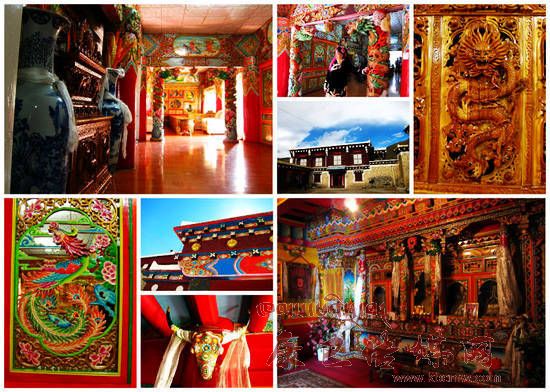 這些民居外表主要由棕白兩色構(gòu)成,白色的屋頂,白色的主墻,木結(jié)構(gòu)處多用棕色顏料染涂,其間配以紅、藍圖案,在藍天、白云、青山、綠水的映襯下,幻化成妙不可言的積木圖案。白色的房頂與寬敞的院壩里,身著艷麗藏裝的少女或身著絳紅色衣衫的喇嘛飄拂其間,給人一種“世外桃源”的感覺。