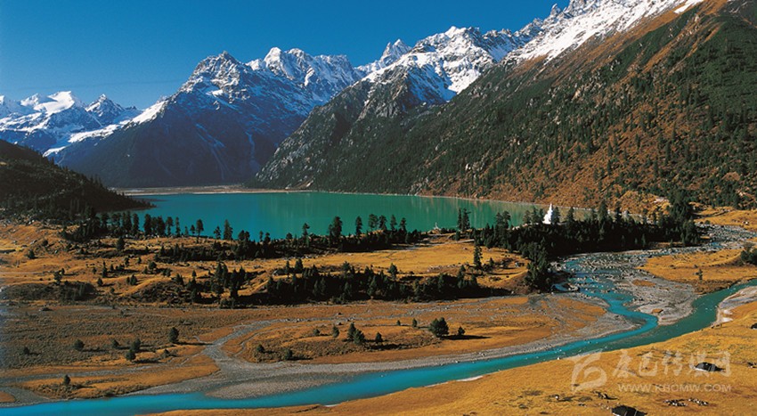 玉隆拉措又名新路海,海拔4040米,傍川藏公路。新路海為冰川湖泊,平均水深10米,面積6.2平方公里。湖泊三面依山,一面臨塬,凝靜時“秋水共長天一色”,象一碩大的明鏡映奇瑰山色于水中,又如靚藍的畫布上碧峰入幀;時有輕風蕩來,湖中波光瀲滟,若仙女弄影。夏季湖水清澈見底,冬春時則靜謐得滲出翠綠來。正面處是一座雪影婆娑的奇峰,巋然不動;與雀兒山相呼應,兩峰之間冰清玉潔,整個溝壑處冰瀑縱橫錯落,呈跳躍狀直撲谷底而來。