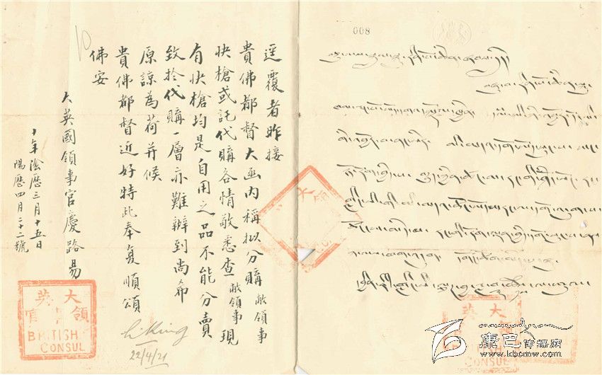 可以肯定的是,這就是給某位活佛的復(fù)信,除了稱呼佛都督(這是在當(dāng)時(shí)對(duì)活佛的通行的敬稱)可以看出外,還有藏文可以佐證。這張紙片上寫道:昨接貴佛都督大函,內(nèi)稱,擬分購(gòu)敝領(lǐng)事館快槍或托代購(gòu)各情敬悉。查敝領(lǐng)事現(xiàn)有快槍均是自用之品,不能分賣。致于代購(gòu)一層,亦難辦到,尚希原諒為荷,并候貴佛都督近好,特此奉復(fù),順頌佛安。署名是大英國(guó)領(lǐng)事館官慶路易,日期為十年陰歷三月十五日,陽(yáng)歷四月二十二日。在公章下面注有公元1922年4月22日。