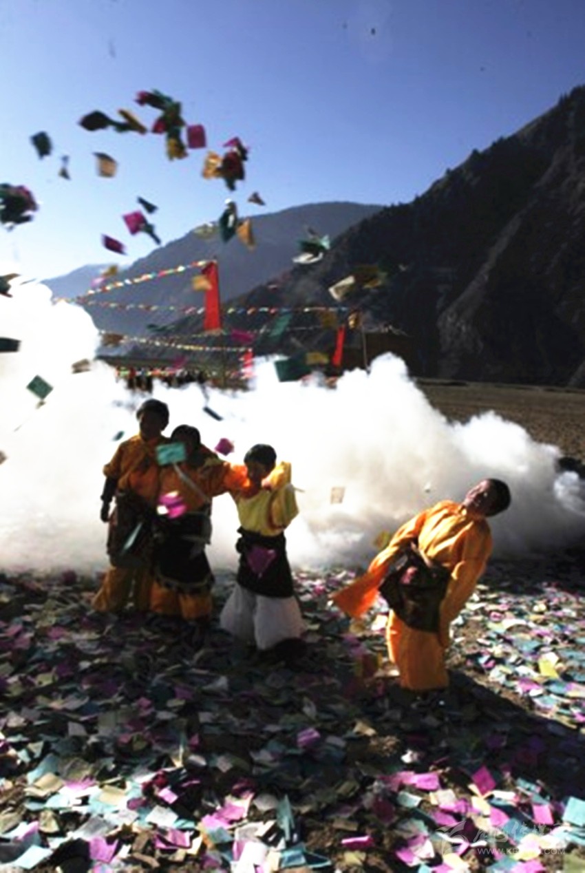 正午時(shí)分,村里的小伙子身著節(jié)日盛裝,手持木刀、木劍,肩扛松星到神山去祭山神,將木刀、木劍和松星插在神塔上,他們認(rèn)為這樣做就可以全副武裝山神了,任何妖魔鬼怪都不敢來侵?jǐn)_村莊了。小伙子們?cè)谏袼赃咟c(diǎn)燃柏枝,撒上青稞酒、糌粑、酥油、茶葉、大米等,然后圍著白塔轉(zhuǎn)經(jīng),呼喚著各種動(dòng)物的名字,喇嘛在一旁齊聲祈福。新龍人特別注重過十三節(jié),所有讓人興奮的娛樂活動(dòng)都會(huì)在十三這天下午在村子里隆重上演,村民不僅是各種娛樂活動(dòng)的參與者,更是最忠實(shí)的觀看者。
