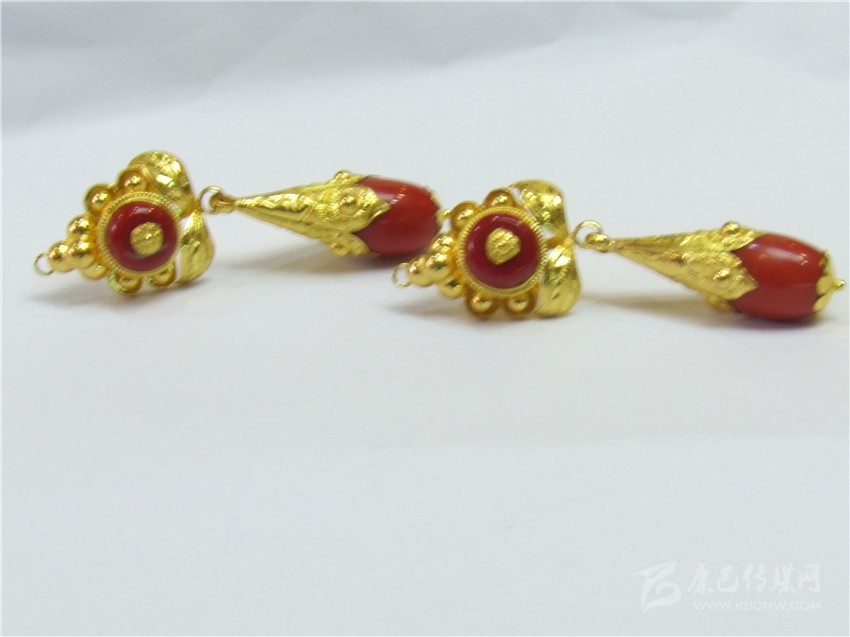 經(jīng)典的紅綠配耳環(huán)。撞色一直都是永不落伍的時(shí)尚,紅綠搭配的巧合,是藏民族熱愛生命與熱情好客的象征,用流光溢彩的金色將紅與藍(lán)包圍并連接,看起來(lái)協(xié)調(diào)而美好,搭配起來(lái)更為時(shí)尚。據(jù)店家介紹,此款耳環(huán)凈重22.75克,加上手工費(fèi),售價(jià)7000余元。