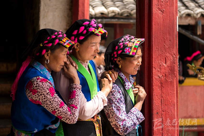 在魚通地區(qū),不少人還保持著古老的裝束,男子穿青色或黑色的長布衫,用布帶束腰,勞作或天冷時會在外加一件用動物皮加工做成的皮褂子,老人以青布包頭,帕長約3丈左右,纏成大盤頭。女子也穿長衫,頭戴方形青色頭帕,腰系圍腰帕。頭帕繡有彩色花邊,發(fā)辮用青色、藍色或紅色的絨線盤于頭帕之上。圍腰帕為梯形,上窄下寬,邊緣用藍色或淺綠色布料做裝飾。圍腰帕分為兩種,一種繡著各種精美圖案,一般在重大節(jié)日和喜宴上穿戴,一種比較簡潔素凈,一般在日常生活中穿戴。
