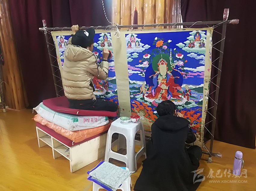 今年初秋,在爐霍縣郎卡杰唐卡演展中心門外場(chǎng)地上,三位學(xué)生正在打磨用牛膠和礦物粉浸潤(rùn)后晾干的畫布,他們將畫布平鋪在木板上,用倒扣的瓷碗一遍遍仔細(xì)地磨著。這是繪制唐卡的最初階段,也是爐霍縣唐卡協(xié)會(huì)專門為廣東媒體甘孜文化行記者安排的觀摩節(jié)目,讓大家迅即有零距離接觸唐卡的感覺(jué)。爐霍縣文化館館長(zhǎng)、郎卡杰唐卡繪畫藝術(shù)協(xié)會(huì)會(huì)長(zhǎng)雍珠洛吾由此開始,一步步帶我們走進(jìn)唐卡制作和郎卡杰唐卡藝術(shù)的世界。