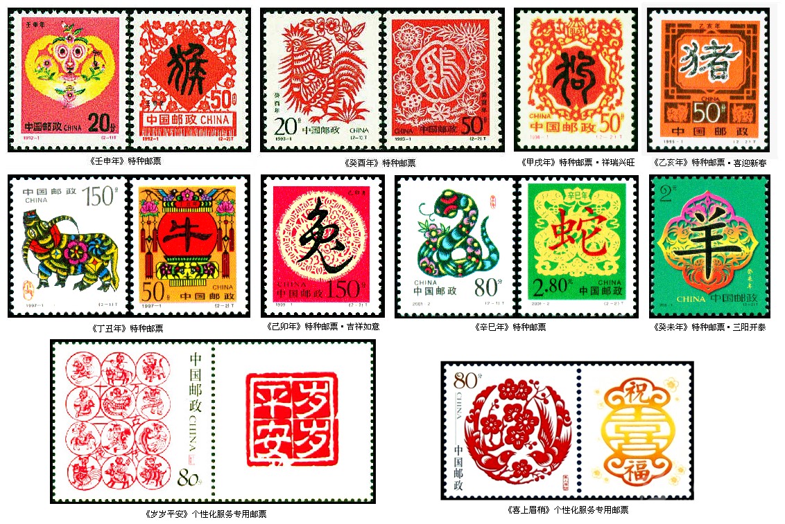 剪紙作為藝術(shù)百花園中的一朵奇葩,在我國郵票圖案設(shè)計中應(yīng)用也非常廣泛。由于傳統(tǒng)的民間剪紙有著濃郁的吉祥喜慶氣氛,因此在我國近些年發(fā)行的生肖郵票中多次出現(xiàn)剪紙藝術(shù)。在第二輪12套24枚生肖郵票中的剪紙圖案分別有1992年《壬申年》的“猴桃獻(xiàn)瑞”和“喜鵲登梅”、1993年《癸酉年》的“雄雞報曉”和“四季吉祥”、1994年《甲戌年》的第二枚“祥瑞興旺”、1995年的《乙亥年》的第二枚“喜迎新春”、1997年的《丁丑年》的“金牛奮蹄”和“牛耕年豐”、1999年《己卯年》的第二枚“吉祥如意”、 2001年《辛巳年》的“祥蛇祝福”和“祥運(yùn)普照”以及2003年的《癸未年》第二枚“三陽開泰”等。這些郵票中剪紙圖案有的直接取材于民間,有的則是在原作基礎(chǔ)上再創(chuàng)作。如“雄雞報曉”一枚,圖案選用的是河北省獻(xiàn)縣本齋鄉(xiāng)鄧家莊蔡蘭英老人的剪紙“百雞圖”中的一幅,而“金牛奮蹄”一枚,圖案是根據(jù)山東高密民間藝人齊秀花的剪紙“媳婦騎?!痹偌庸?chuàng)作而成的。在我國發(fā)行的祝福系列個性化服務(wù)專用郵票中也有吉祥喜慶的剪紙圖案,即2005年11月6日的《歲歲平安》和2005年11月11日的《喜上眉梢》等。