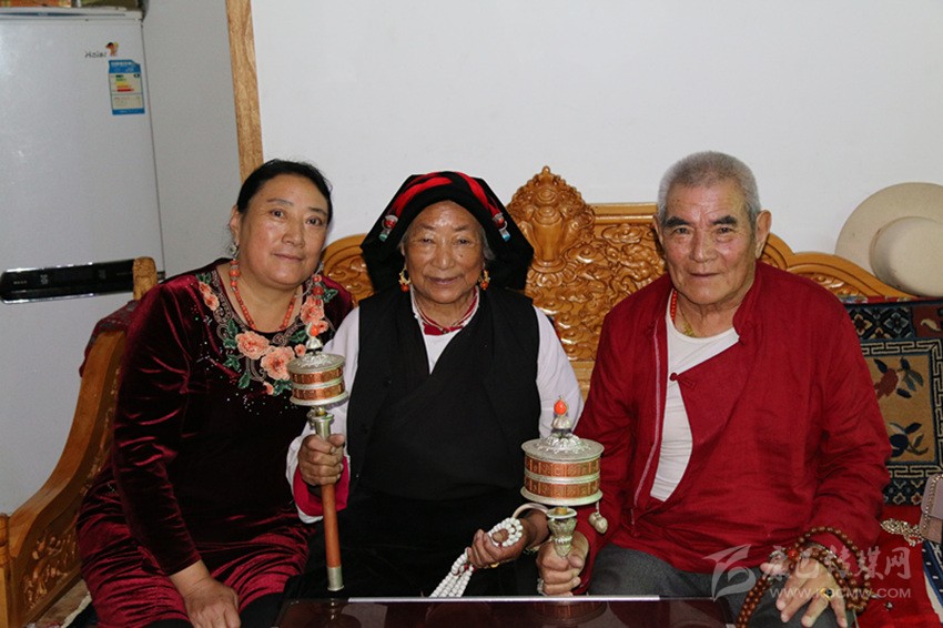 過了一會(huì)兒,兩位步履蹣跚的老人先后走了進(jìn)來。其中,一位杵著拐杖,一位搖著經(jīng)筒?!昂炔?、喝茶。”見到記者一行,老人十分熱情。