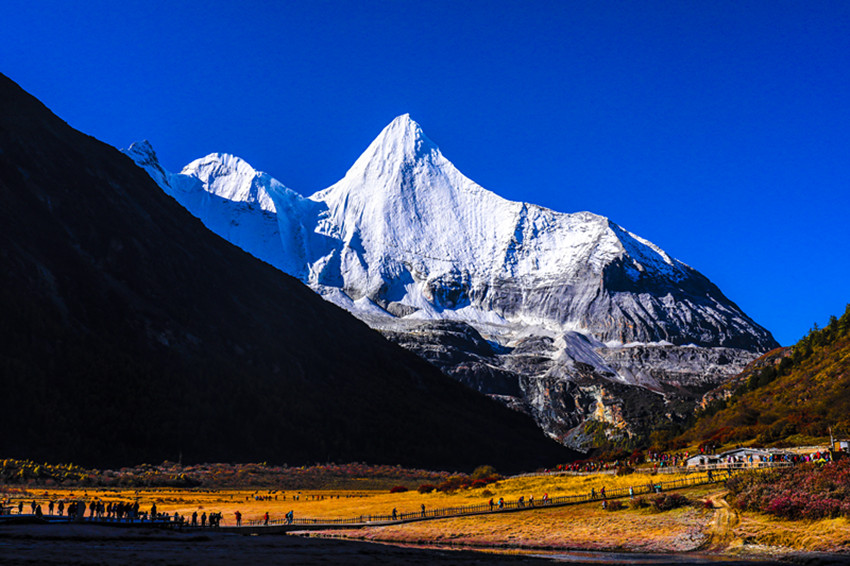 走過山走過水,觀一路秋色,描摹一生的畫卷。在亞丁的晚秋,可以感受“遠(yuǎn)看山有色,近聽水無聲”的畫面,在亞丁的晚秋,可以體驗(yàn)“愁因薄暮起,興是清秋發(fā)”感覺。在亞丁的晚秋,總會(huì)有李清照那句“秋已暮、紅稀香少。水光山色與人親,說不盡、無窮好”在腦海浮現(xiàn)??偢袊@景色太美,文筆笨拙,要是“俱懷逸興壯思飛,欲上青天覽明月”的李白在“抽刀斷水水更流,舉杯消愁愁更愁”的多愁善感里描繪三怙主的雄奇與牛奶海的柔美,那不知道又是一個(gè)多么驚世駭俗的偉大手筆?沒有也許,只有在些許的缺憾中努力書寫屬于這個(gè)秋的一切。是的,秋已暮,珍珠海的水碧波不興,雪山的倒影更顯雄偉與圣潔。秋已暮,五彩山林和潺潺流水纏綿無盡,已經(jīng)把美輪美奐的山水畫鋪展在天地間。秋已暮,牧歸炊煙起,草原已寂靜。