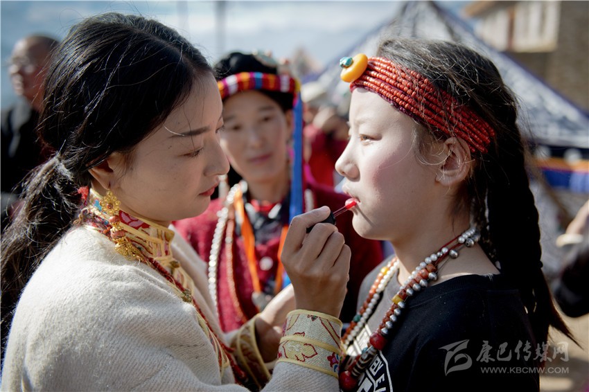 盤好發(fā)髻,佩戴好頭飾,在肩、背系好五彩哈達(dá)后,由本村具有威望的女性長者引領(lǐng)來到儀式現(xiàn)場。法號聲中,煨桑的青煙裊裊升起,威嚴(yán)的活佛主持誦經(jīng)祈福儀式。隨后,德高望重的長者為參加儀式的女子送祝福茶,長輩為姑娘們獻(xiàn)哈達(dá)。一系列儀式結(jié)束后,無論男女老少,都來到場地中央,踏歌起舞,跳起吉祥的鍋莊。