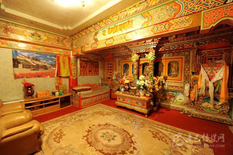 藏族居室一般分臥室、客廳、經(jīng)堂和廚房等部分。室內(nèi)陳設(shè)與裝飾如藏式建筑學(xué)者葉啟燊所言:“主次分明,重點(diǎn)突出。主室較為復(fù)雜而樸素,經(jīng)堂偏于華麗而清幽,其余各室均較簡(jiǎn)單。室內(nèi)都不施粉刷,但有個(gè)別的經(jīng)堂作雕刻裝飾;土司和喇嘛上層的經(jīng)堂則會(huì)作油漆的彩畫?!辈貐^(qū)不論是農(nóng)牧民住宅還是貴族上層府邸都有供佛的設(shè)施,經(jīng)堂屬于凈地,是專門供奉神佛的,因此,一般不作他用;主室是藏族住宅中最重要的一個(gè)房間,也是功能最多的房間,其中有生活、睡眠、飲食等所需的爐灶、壁櫥、壁架、矮桌、火盆等。這些藏式家具的布置安放,早已形成一定之規(guī)。