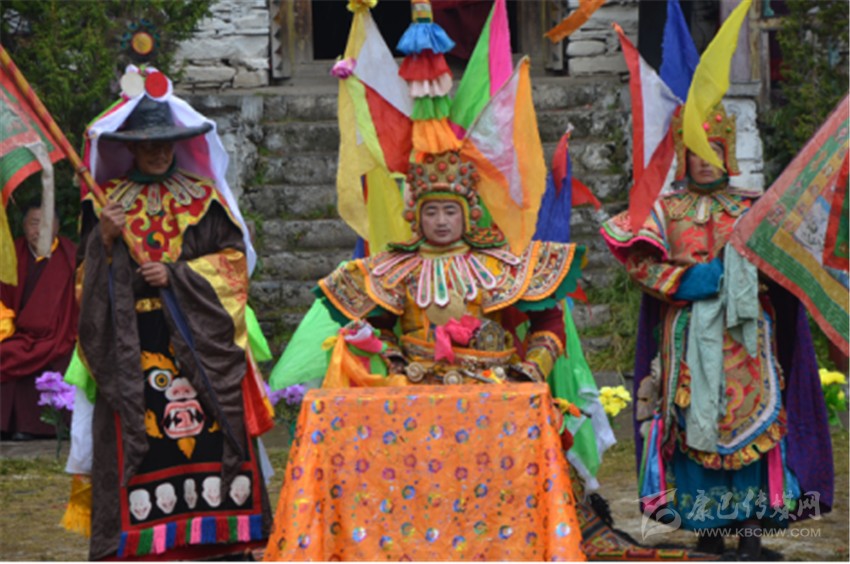 思路還是回到戲劇問題上來,在我以往欣賞的藏戲,其演出場所都設(shè)在露天,演員和觀眾在同一平臺(tái)的草地上,有時(shí)在平臺(tái)四周有山坡,那便是觀眾最好的看戲處。不過,從高處往低處看,效果還是不及平視的效果好。表演藏戲的舞臺(tái)在草地中央,觀眾圍著中央草地形成一個(gè)半包圍圈,演出幾乎沒有布景,即便有,也是簡單的一些桌椅、祭臺(tái)之類的簡單道具。在演出中,一個(gè)演員身著各類色彩鮮艷的帽、旗及其盔甲服裝等大于人體體型的飾物,這樣做的目的顯然是為了增強(qiáng)演出的鮮明性,尤其演員穿著厚底高靴,體型龐大,頭戴面具,嗓音洪亮,動(dòng)作凝重而富有節(jié)奏,使整個(gè)演出富有較強(qiáng)的穿透力和沉重感。藏戲的音樂也比較簡單,主音節(jié)奏依靠長號(hào)、大鼓、鈸等,曲目轉(zhuǎn)換時(shí)則多以笛子演奏,間或插入海螺聲、嗩吶聲等。整個(gè)藏戲的故事情節(jié)則是依靠舞蹈和合唱來漸次推進(jìn)的。藏戲作為祖國文化大家庭中的成員之一,自然有著自己獨(dú)特的特點(diǎn),有著屬于自身的文化藝術(shù)和生活土壤的傳承因子。藏戲誕生在一個(gè)特殊的環(huán)境里,它既在風(fēng)格、形態(tài)、特征和韻致上包含著與其他戲劇相似的共通性,同時(shí),它又蘊(yùn)涵著與眾不同的自身的內(nèi)涵特征。總之,藏戲在“歌、舞、劇、技等方面的有機(jī)結(jié)合,虛擬寫意的表現(xiàn)型戲劇,程式化表演手段,自由靈活的演出時(shí)空概念,??????它又具有與古希臘戲劇很類似的貫穿始終的講解人和伴唱伴舞隊(duì),面具表演,三面以至四面觀眾的廣場演出,一部分生活化寫實(shí)表演,演出時(shí)空的間接固定場景,史詩式講唱文學(xué)的劇本結(jié)構(gòu)和說唱藝術(shù)的演出格式等特殊之處?!薄緞⒅救骸吨袊貞蚴贰?/span>4頁】因此,在藏戲的諸多元素中,我們可以看到顯著的特征,這就是明顯的原始巫文化和原始苯教文化的痕跡,無論是在藏戲的臺(tái)詞、面具和服飾中,還是在藏戲的音樂、樂器和表演形式上,不難看出藏戲的這一本土特征,至于與其他戲劇流派的類似之處,我以為,一方面是戲劇本身固有特征的表現(xiàn),另一方面或許是一種合理吸納所致。