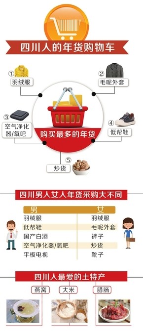 還有幾天就過(guò)年了,你們家買(mǎi)了哪些年貨?近日,電商平臺(tái)阿里巴巴和京東先后推出了年貨大數(shù)據(jù)。從這些數(shù)據(jù)中,我們能看到一個(gè)典型成都人的年貨網(wǎng)絡(luò)購(gòu)物車(chē)是這樣的:購(gòu)買(mǎi)最多的年貨還是衣服,其中羽絨服、毛呢外套是成都人的最?lèi)?ài);家電和電子產(chǎn)品愛(ài)買(mǎi)空氣凈化設(shè)備和玫瑰金iPhone7手機(jī);食品是山核桃等炒貨,以及國(guó)產(chǎn)白酒。在女性偏好酒水消費(fèi)的排名中,四川女性排名第五。