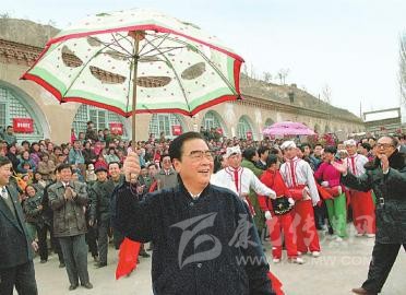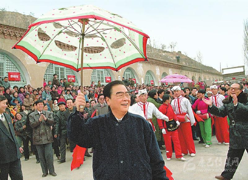 1996年2月19日至20日,李鵬同志回到闊別50年的延安,看望、慰問延安地區(qū)的干部群眾,和老區(qū)人民一起過年。這是大年初一,李鵬同志同棗園村秧歌隊(duì)一起扭起陜北大秧歌。新華社記者 劉建國 攝