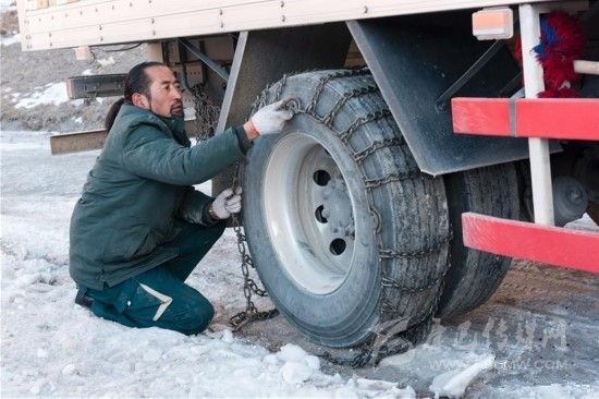 其美多吉在途中幫助社會(huì)車輛安裝防滑鏈(資料照片)。其美多吉是中國(guó)郵政甘孜縣分公司郵運(yùn)駕駛組的一名郵車司機(jī),往返在甘孜縣與德格縣之間。這段路程是四川省甘孜州綿延5866公里、平均海拔超過(guò)3500米的雪線郵路最危險(xiǎn)的一段。新華社發(fā)(周兵 攝)