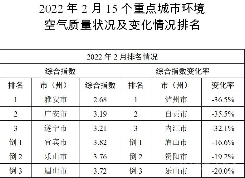 今年2月,四川15個(gè)重點(diǎn)城市(全國(guó)168個(gè)重點(diǎn)城市)中環(huán)境空氣質(zhì)量較好的前3名依次為雅安市、廣安市、遂寧市,環(huán)境空氣質(zhì)量較差的后3名依次為宜賓市、樂(lè)山市、眉山市。這是四川在線記者3月28日從四川省生態(tài)環(huán)境廳召開(kāi)的新聞發(fā)布會(huì)上獲悉的。