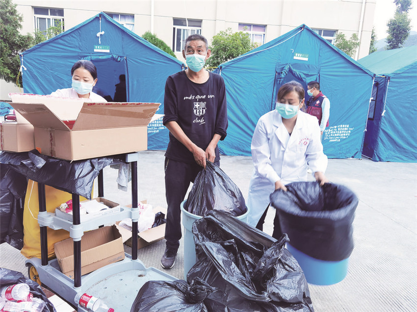 祝錫琴、齊天清在處理接診點(diǎn)垃圾。