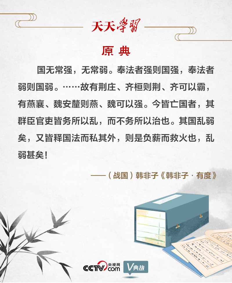 韓非子認(rèn)為,各國(guó)皆有法度,關(guān)鍵是能否秉公執(zhí)法。他以荊莊王(楚莊王)、齊桓公、燕襄王、魏安釐(xī)王為例,說(shuō)明君主若能堅(jiān)決推行法治,國(guó)家就能強(qiáng)盛?!敖窠酝鰢?guó)者,其群臣官吏皆務(wù)所以亂,而不務(wù)所以治也。其國(guó)亂弱矣,又皆釋國(guó)法而私其外,則是負(fù)薪而救火也,亂弱甚矣!”意思是,現(xiàn)在這些國(guó)家都已衰落,是由于他們的大臣官吏,都去做使國(guó)家亂而不是使國(guó)家治的事情。國(guó)家已經(jīng)衰落,又都舍棄國(guó)法而營(yíng)求私利,如同負(fù)薪救火,國(guó)家就更衰落了。