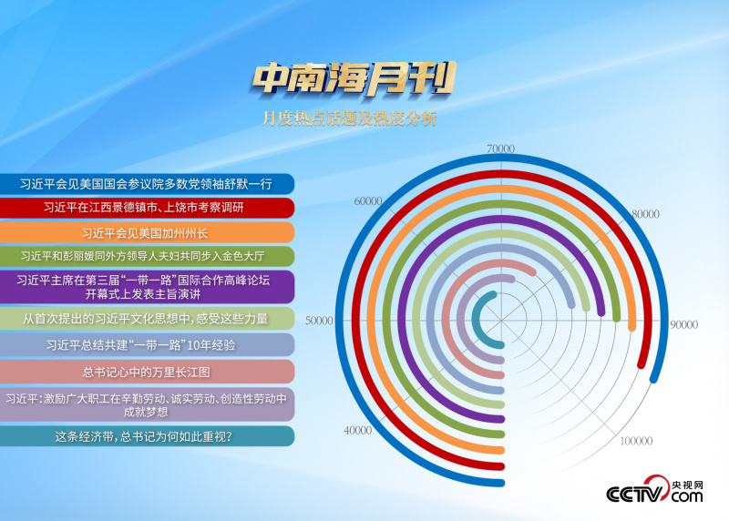 央視網(wǎng)“智聞”系統(tǒng)提取分析10月全網(wǎng)時政新聞熱點顯示,“習近平主席會見美國國會參議院多數(shù)黨領袖舒默一行”“習近平會見美國加州州長”“習近平主持召開進一步推動長江經(jīng)濟帶高質(zhì)量發(fā)展座談會”等話題最受網(wǎng)民關(guān)注。