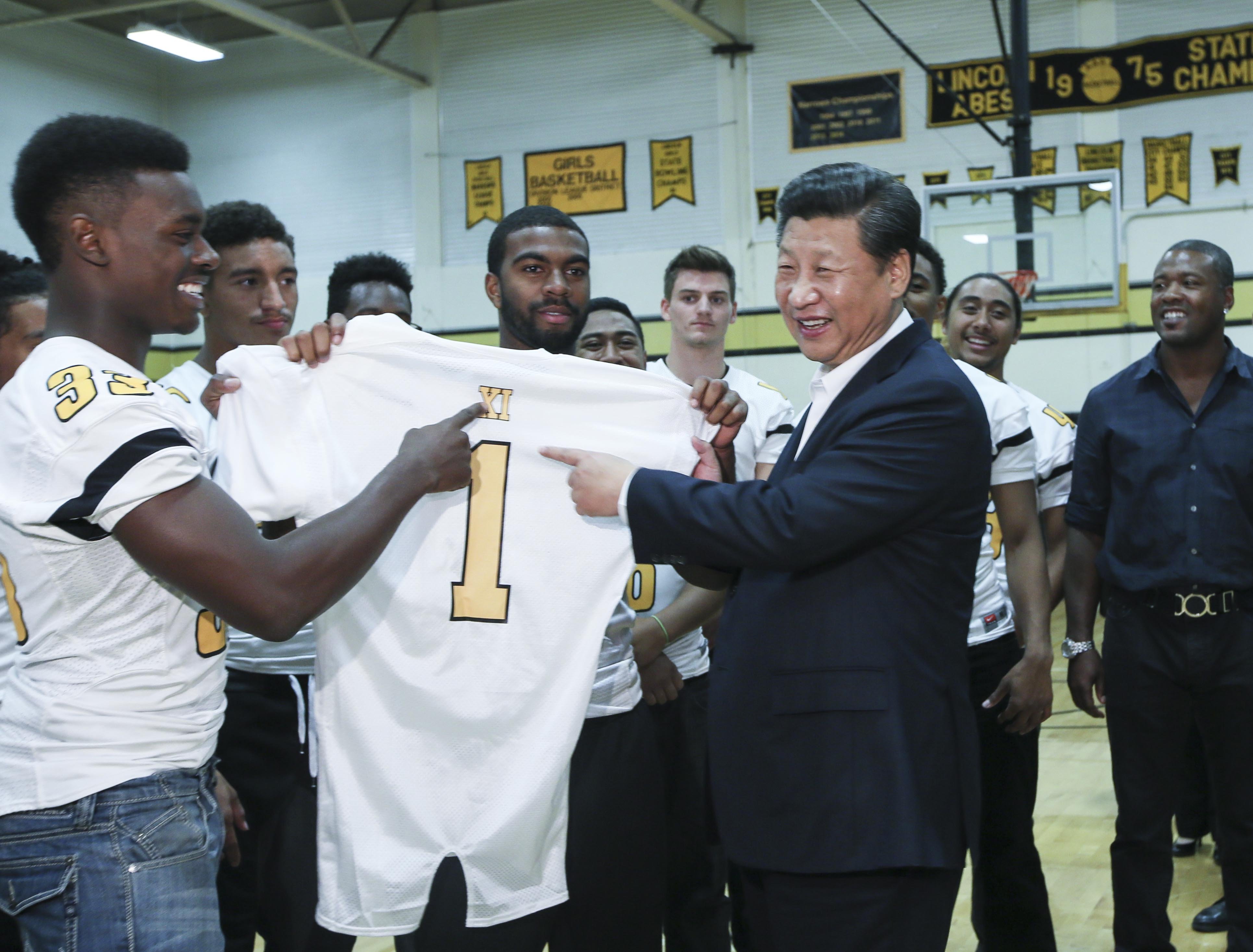 △ 2015年9月23日,國家主席習近平參觀美國塔科馬市林肯中學(xué)。這是習近平接受學(xué)生們贈送的橄欖球衣。