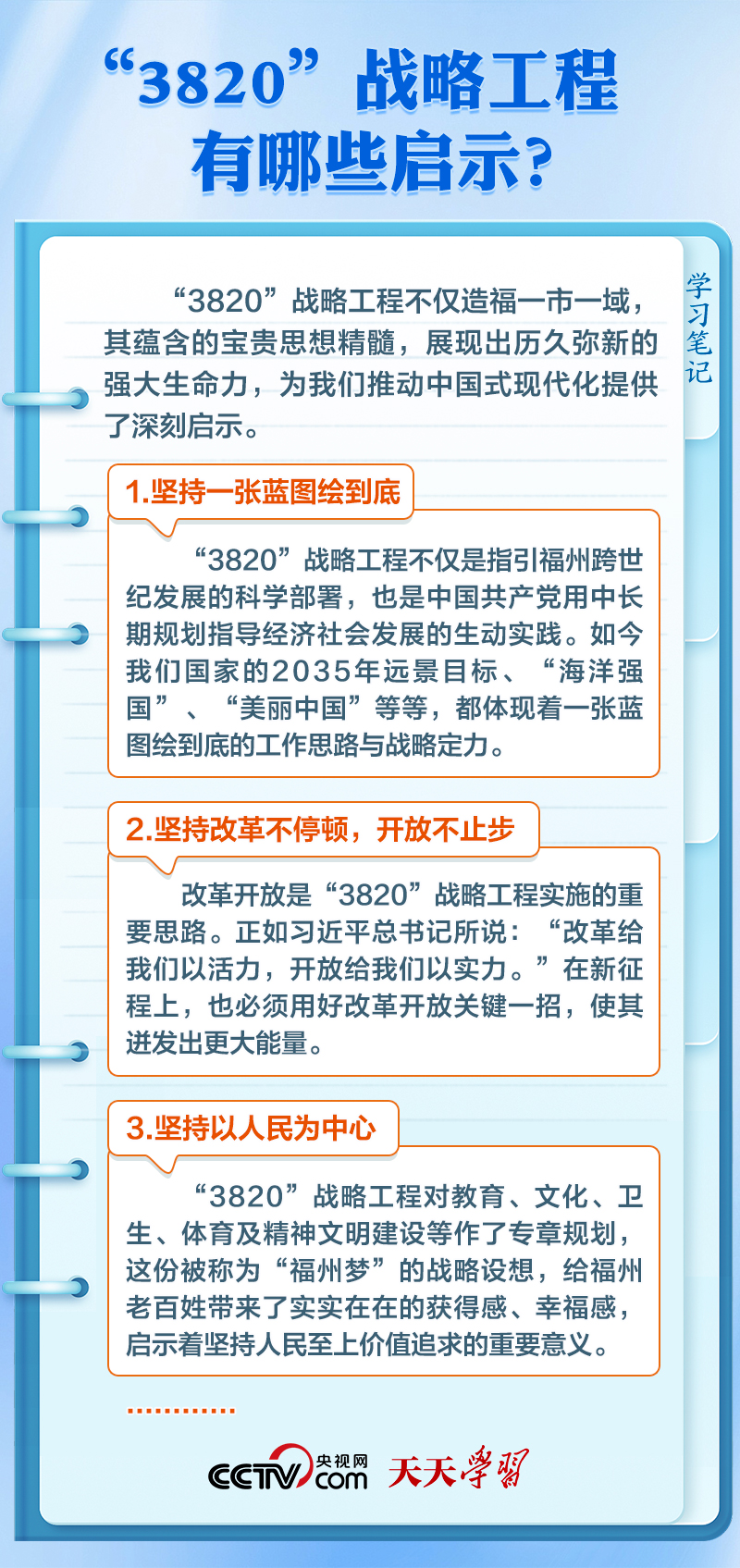 天天學(xué)習(xí)上世紀(jì)90年代,習(xí)近平在福州工作期間,親自主持編制了《福州市20年經(jīng)濟(jì)社會(huì)發(fā)展戰(zhàn)略設(shè)想》(簡(jiǎn)稱(chēng)“3820”戰(zhàn)略工程),系統(tǒng)謀劃了福州3年、8年、20年經(jīng)濟(jì)社會(huì)發(fā)展的目標(biāo)、步驟、布局、重點(diǎn)等,為福州擘畫(huà)了美好藍(lán)圖,確立了總綱領(lǐng)、總方略。