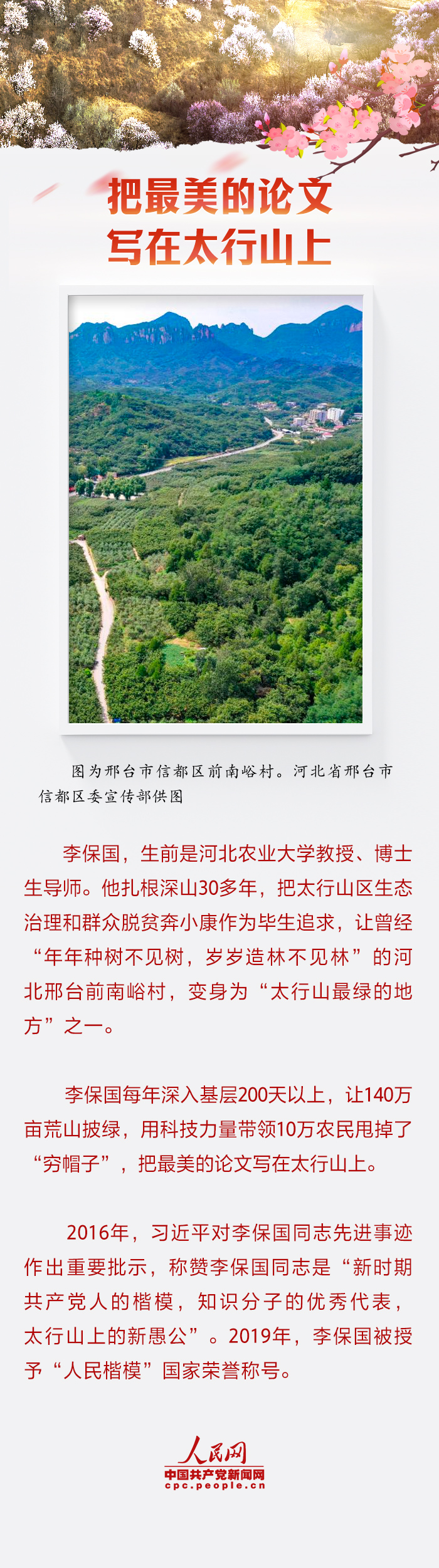 習(xí)近平總書記連續(xù)十多年履行與春天的“綠色約定”,心系國土綠化事業(yè),引領(lǐng)推進(jìn)生態(tài)文明建設(shè)?!白ド鷳B(tài)文明建設(shè),既要靠物質(zhì),也要靠精神。”習(xí)近平總書記曾多次提到英模厚植精神之“樹”為人民謀幸福的事跡,一起學(xué)習(xí)領(lǐng)悟。