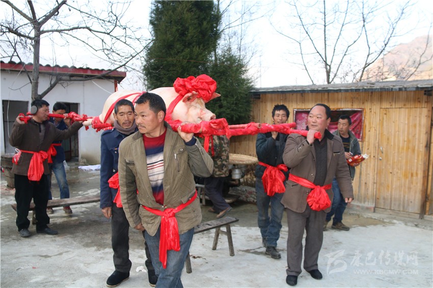 5個(gè)村民將年豬抬到秤上。360斤。村民為年豬準(zhǔn)備大紅花。準(zhǔn)備紙錢、香蠟。9點(diǎn)整,殺豬匠開始了他的工作,在眾人齊心協(xié)力下,光溜溜的年豬被打整干凈。“保佑我們村來年風(fēng)調(diào)雨順、五谷豐登,村民平安健康?!贝逯欣险呔催^天地后,8個(gè)身強(qiáng)力壯的村民站在年豬旁,豎著拇指齊聲說,今年家家戶戶還要養(yǎng)大肥豬。抬著年豬,村里的中老年人簇?fù)碇?,走在最前面,唱著悅耳的民謠,大意是歌唱幸福生活的,迎著2018年的第一縷陽光,村民們喜氣洋洋。到村里來的游客蜂擁拍照。