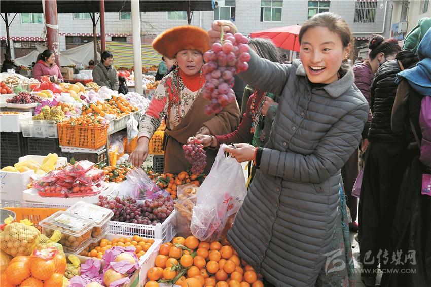 新都鎮(zhèn)格色村的丹真大哥和老伴兒其吉牽著8歲的孫子正在干果店里挑選各類干果,身后的背簍里水果、蔬菜、酥油、牛肉等農(nóng)畜產(chǎn)品以及中國結(jié)、年畫、對(duì)聯(lián)、掛圖等吉祥的節(jié)日物品應(yīng)有盡有。