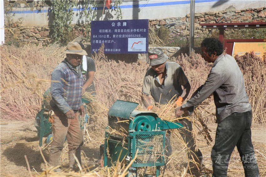 金秋的陽光熾熱溫暖,得榮縣白松鎮(zhèn)奪松村一片祥和安寧。11月10日,村民們正在村活動(dòng)室的院壩里脫粒藜麥,豐收的喜悅寫在忙碌的村民的臉上?!按蠹壹佑透?,把藜麥交給公司,立馬可以拿到現(xiàn)錢?!眾Z松村委會(huì)副主任四郎都遷高興地說,盤點(diǎn)收成,今年又是一個(gè)豐收年。
