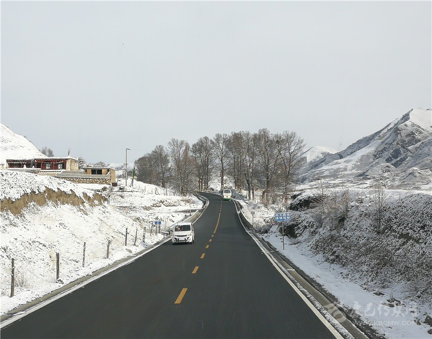 安全通過折多山后,天已完全放亮,只見道路兩邊的山丘、草地和樹木全被積雪覆蓋,與之形成鮮明對(duì)比的是一條寬闊平整的黑色柏油路,整個(gè)畫面就像一幅水墨畫,而我們這車人就行進(jìn)在“畫中”。