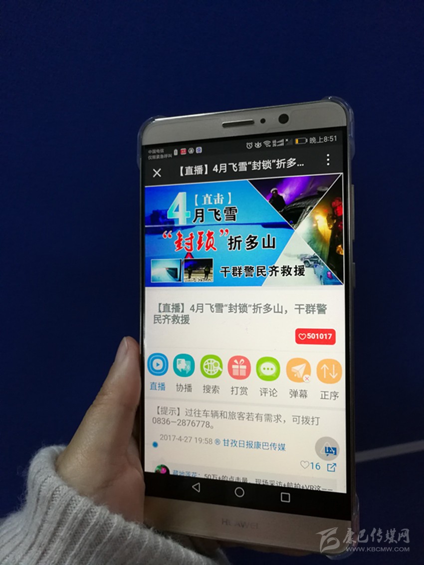 一路上,記者通過甘孜日報微信平臺,將救援情況和群眾的實況,第一時間進(jìn)行了直播。隨著一條條現(xiàn)場圖片、文字和視頻的及時發(fā)布,人們第一時間得知了折多山受困車輛和群眾得到救助的實際情況,人們紛紛在直播平臺留言,為交通、路政和當(dāng)?shù)攸h委、政府的救援行動點贊。在對折多山強(qiáng)降雪和受堵現(xiàn)場進(jìn)行直播報道的同時,甘孜日報社還利用直播平臺,回顧了折多山道路交通難的歷史,并再次發(fā)布雅康高速修建、折多山隧道立項等重大交通建設(shè)工程的進(jìn)展情況,又對此次折多山風(fēng)雪阻斷道路交通,導(dǎo)致車輛和人群滯留的特殊原因進(jìn)行了報道和澄清,并報道了風(fēng)雪中仍有不少徒步游客繼續(xù)甘孜之旅的情況,第一時間讓更多的人了解到,飛雪并未對道路造成致命影響,甘孜州的道路交通狀況和應(yīng)急處置能力已經(jīng)得到了極大的提升,完全有能力保障人們出行以及生命、財產(chǎn)安全。