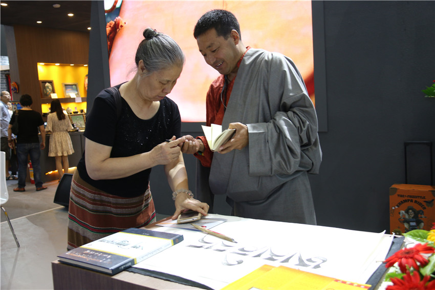 而在同一地點(diǎn)的另一側(cè),省級(jí)藏文書法傳承人巴松鄧珠的藏文書法也吸引著眾多愛(ài)好書法市民前來(lái)觀賞,還有的與他合影?!爸笇?dǎo)過(guò)我的書法家非常多,他們不僅給了我許多寶貴的意見(jiàn),更重要的是給了我信心和動(dòng)力,讓我堅(jiān)持寫書法,并成為康體藏文書法的傳承人?!卑退舌囍檎f(shuō),這次能夠得到州委、州政府搭建的平臺(tái),我會(huì)珍惜好這次難得的機(jī)遇,把作品展示好、宣傳好,讓全國(guó)各地的人們更多地了解我州民族文化。