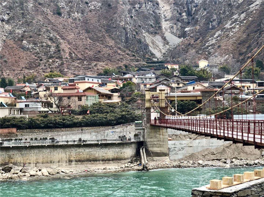 來到時濟鄉(xiāng),鐵索橋?qū)Π毒褪侨艏?,流淌的大渡河水從橋下穿過,若吉村內(nèi)正在進行民居風貌升級改造,一些改造的民居外形已初顯。