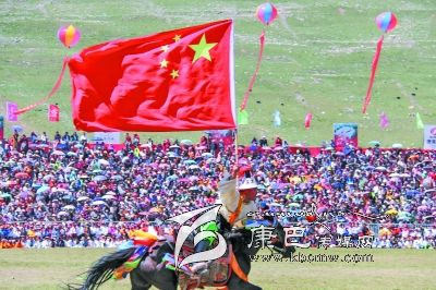 7月25日,第八屆康巴文化藝術(shù)節(jié)在玉樹(shù)藏族自治州開(kāi)幕。數(shù)名參加開(kāi)幕式的藏族老鄉(xiāng)高舉鮮艷的五星紅旗策馬狂奔,風(fēng)馳電掣,跨越扎西科賽馬場(chǎng),一瞬間,歡呼聲震耳欲聾,開(kāi)幕式進(jìn)入高潮。