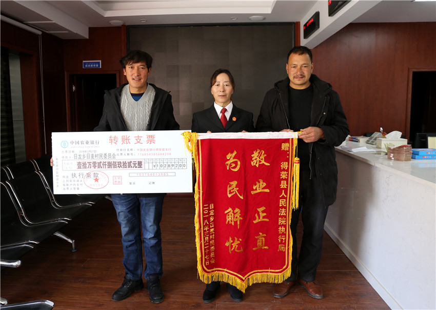 在執(zhí)行款發(fā)放現(xiàn)場(chǎng),得榮法院執(zhí)行局局長(zhǎng)小娜錯(cuò)法官正逐一核對(duì)當(dāng)事人信息,辦理領(lǐng)款手續(xù),她向筆者介紹說:“去年開始,我們?cè)诠矓M定出了29個(gè)基本解決執(zhí)行難的工作任務(wù),形成了7條具體措施,對(duì)所屬的11件執(zhí)行難案每件形成專項(xiàng)行動(dòng)方案,并將‘一案一辦法’的基本原則落實(shí)到了后續(xù)的23件案件執(zhí)行當(dāng)中,取得了良好的執(zhí)行效果,今后我們將持續(xù)深入執(zhí)行難專項(xiàng)行動(dòng),全面深入落實(shí)依法治理,切實(shí)保護(hù)人民群眾的合法權(quán)益,努力讓人民群眾在每一件司法案件中都感受到公平正義,感受到更多的幸福感和安全感?!?/p>