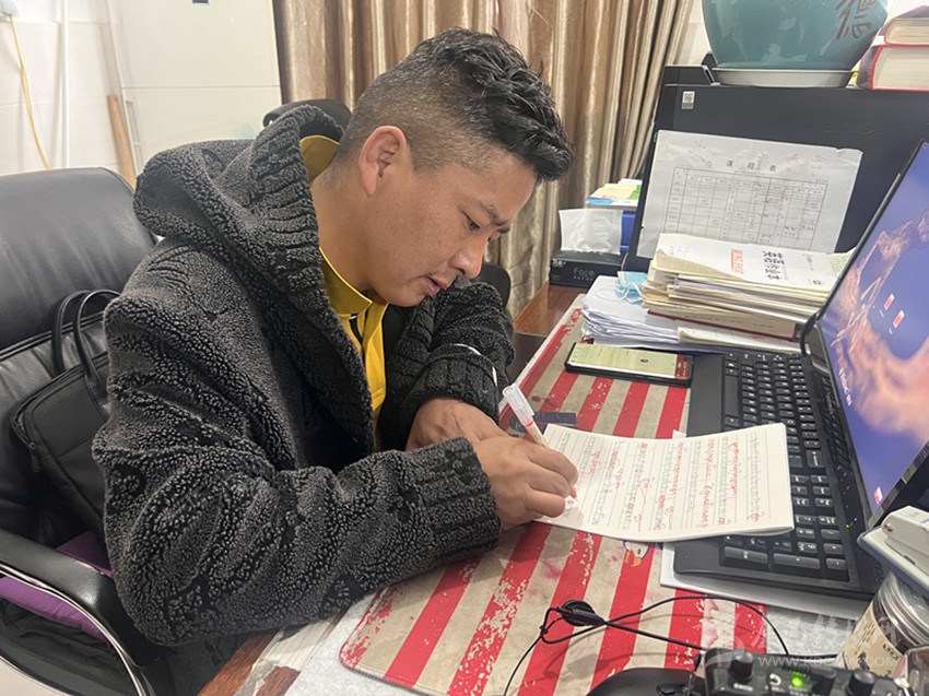 “尼瑪老師不僅對(duì)學(xué)生的學(xué)習(xí)生活關(guān)懷備至,作為任課教師,我們常??吹剿谛菹r(shí)間認(rèn)真?zhèn)湔n。他會(huì)聲情并茂地大聲誦讀精心準(zhǔn)備的課件,大家都覺得很有趣,學(xué)生學(xué)習(xí)的積極性也提高了。他批改作業(yè)也非常認(rèn)真,給每一位同學(xué)寫的評(píng)語(yǔ)都用心用情。他是真的是用全部身心來(lái)對(duì)待工作,不愧是一名優(yōu)秀的老師。”采訪過(guò)程中,筆者偶遇了援建教師廖俊希,談起對(duì)章拉尼瑪?shù)挠∠?,廖俊希的評(píng)價(jià)細(xì)致而中肯。