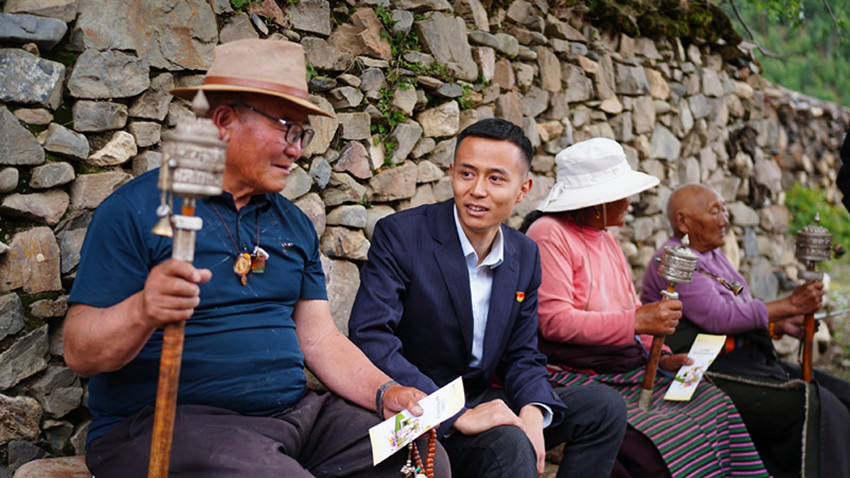 朱楠在理塘縣木拉村走訪群眾,宣傳存款保險服務。