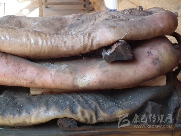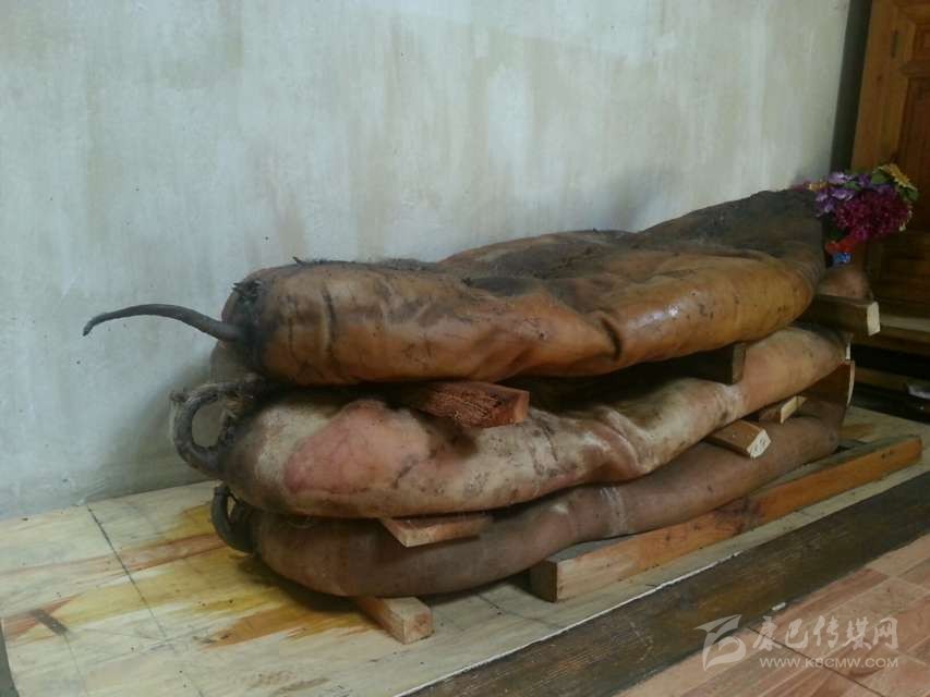 半干豬肉:在丹巴縣革什扎鄉(xiāng)有一種比較奇特的豬肉保存方法:將豬殺死后,不去毛,只在豬的腹部開(kāi)一條口子取出內(nèi)臟,將血水清理干凈后用麻繩將腹部縫合。隨后用當(dāng)?shù)氐狞S泥漿敷在豬身上,在豬的身上形成一個(gè)厚約2厘米的殼,密不透風(fēng)。處理好后將其懸掛于灶塘之上,使黃泥在高溫的烘烤下快速硬化。如若發(fā)現(xiàn)黃泥層出現(xiàn)裂縫,立即用黃泥漿將其修復(fù)。等到第二年熱天時(shí),敲掉黃泥形成的硬殼,豬毛被輕松退去,豬肉依然比較新鮮。但這種保存新鮮豬肉的方法現(xiàn)在已經(jīng)很少見(jiàn)了,一是因?yàn)檫@種保存方法風(fēng)險(xiǎn)太大,稍有不慎豬肉就可能腐敗;二是如今物資供應(yīng)豐富,新鮮豬肉購(gòu)買(mǎi)方便,使得此種儲(chǔ)存方式失去了存在的價(jià)值。