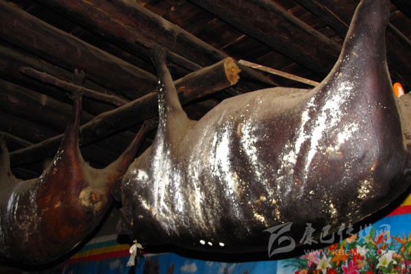 豬膘:在丹巴,豬膘是一種貯存豬肉的方式,是一種飲食習(xí)俗,同時(shí),它又是財(cái)富的象征。在丹巴隨便走進(jìn)一戶(hù)人家都可以看到少則幾扇、多則十余扇的豬膘掛在樓上,有些人家的豬膘甚至還貯存十多年之久。這些豬膘大多已經(jīng)被蟲(chóng)吃掉了許多,但是他們也不會(huì)心痛,因?yàn)樵谶^(guò)去,看一個(gè)丹巴人家庭是否富裕,就看他家有多少豬膘,豬膘越多就越富有。